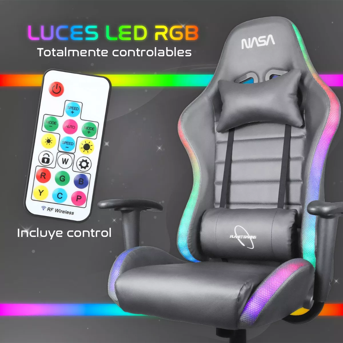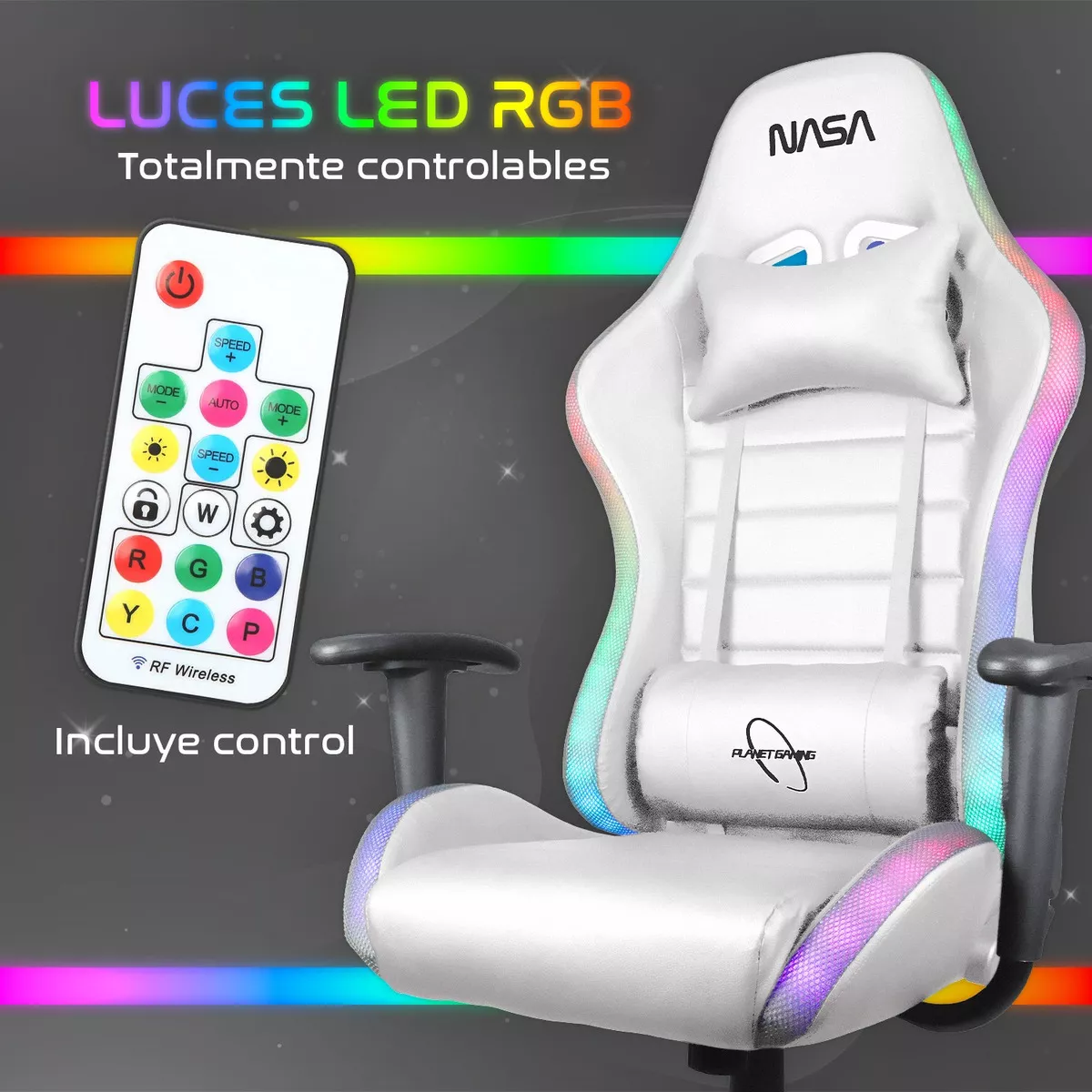 Luces LED RGB totalmente controlables La Silla Gamer con Luz LED NASA Galaxia cuenta con luces RGB totalmente controlables, lo que te permite personalizar la iluminación de tu silla y darle un toque único y personal. Además, incluye un control para que puedas cambiar los colores y los patrones de iluminación a tu gusto.