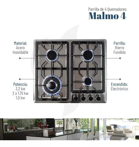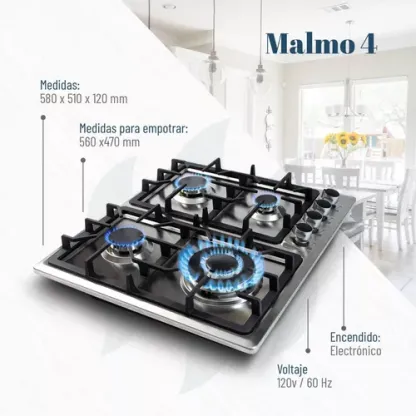 Materiales: Acero inoxidable Potencia: 3.2 kw / 2 x 1.75 kw / 1.0 kw Parrilla: Hierro fundido para máxima durabilidad Perillas: Metálicas de lujo con válvula de seguridad Encendido: Electrónico Gas: Funciona para Gas LP / Natural Voltaje: 120 v / 60 Hz Medidas: 580 x 510 x 120 Medidas para empotrar: 560 x 480