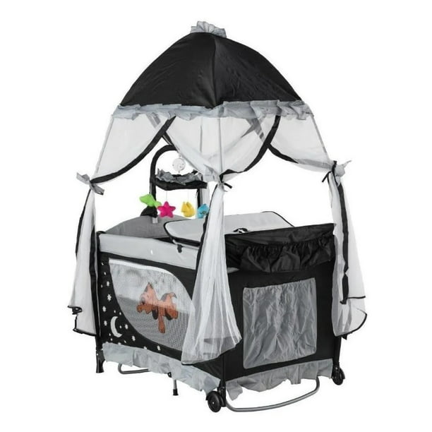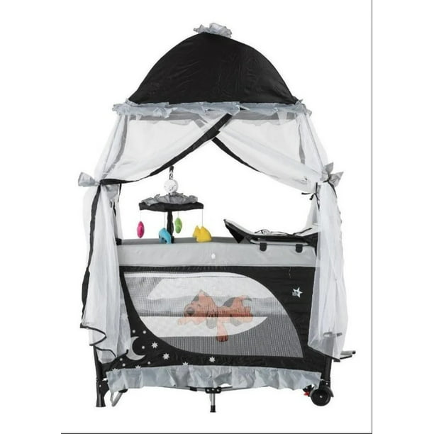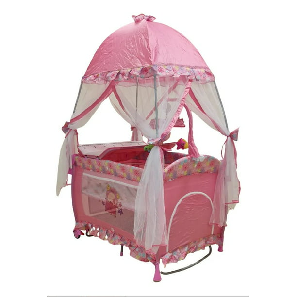• 1 Corral Cuna Para Bebé con toldo y velo de lujo • 1 Móvil musical de cuerda con 4 peluches • 1 Base acojinada • 1 Bolsa para transportarlo