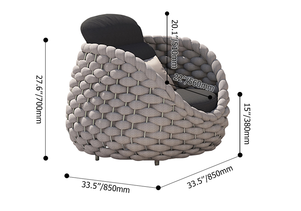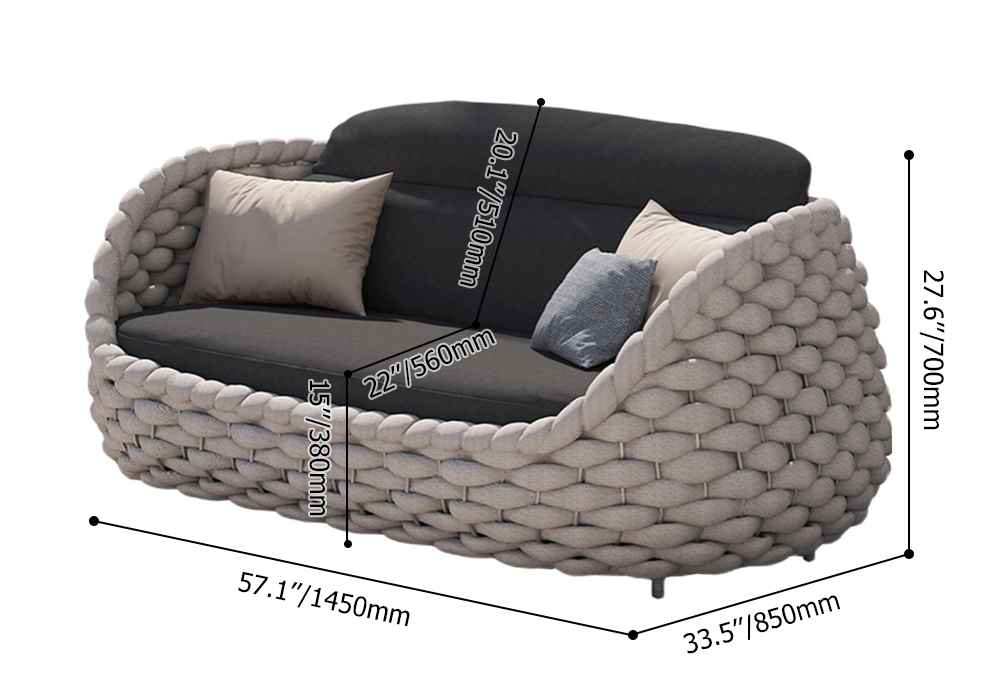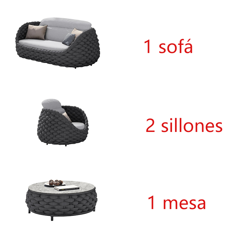 Este sofá emplea una forma en forma de barril. Un marco de aluminio resistente a la oxidación envuelve la brillante cuerda de textileno y los cojines y almohadas de poliéster relleno de espuma de alta resiliencia hacen que el producto completo parezca lleno de comodidad.