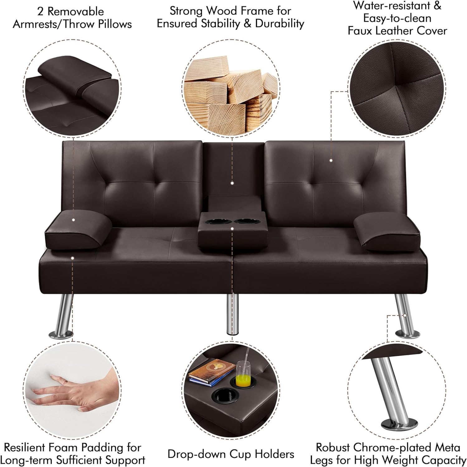 - 【Construido para mayor comodidad y durabilidad】Apoyado por patas de acero chapado en cromo y un marco de madera diseñado, esta cama de futón convertible cuenta con una alta capacidad de hasta 700 libras. Los cojines de espuma resistentes están tapizados en piel sintética agradable al tacto, ofreciendo comodidad adicional y fácil limpieza.