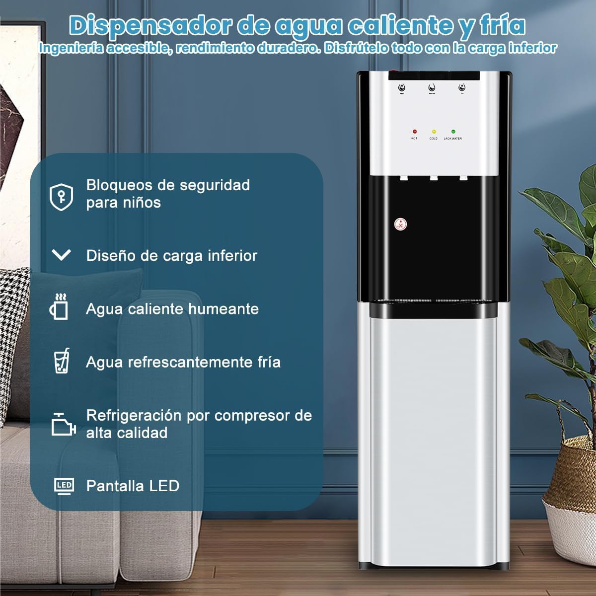 - Este dispensador de agua de carga inferior para botellas de 5 a 20 litros permite cambiar de botella de forma fácil y segura sin necesidad de levantar objetos pesados, dar la vuelta de forma incómoda o derramar líquidos accidentalmente, y es especialmente ideal para personas con limitaciones físicas (como problemas de espalda).