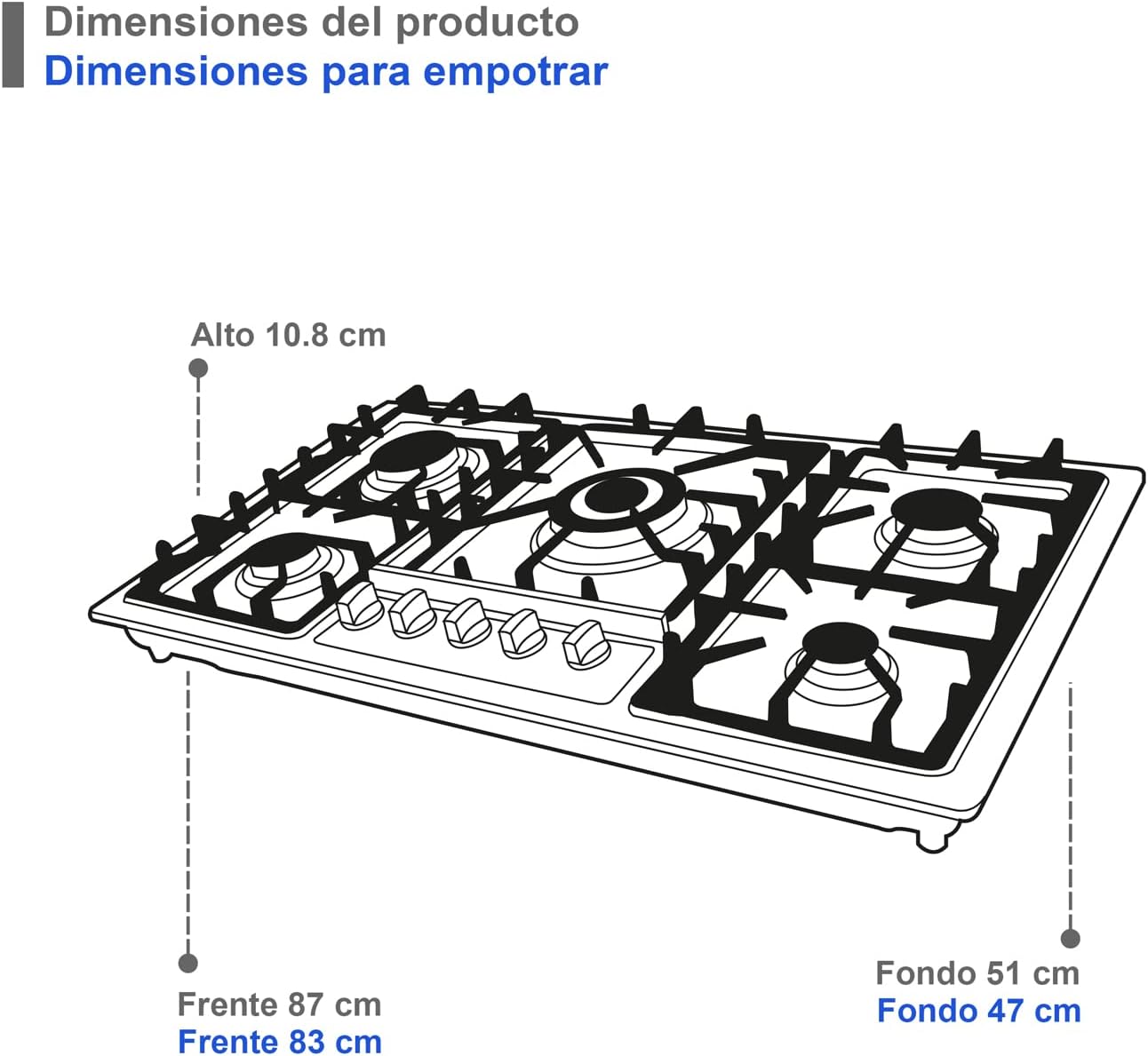Medidas Perfectas: Compacta con dimensiones ideales de 10.8 cm de altura, 87 cm de frente y 51 cm de fondo, adaptándose a cualquier espacio en tu cocina. Ideal para quienes buscan una parrilla eficiente con 5 quemadores.