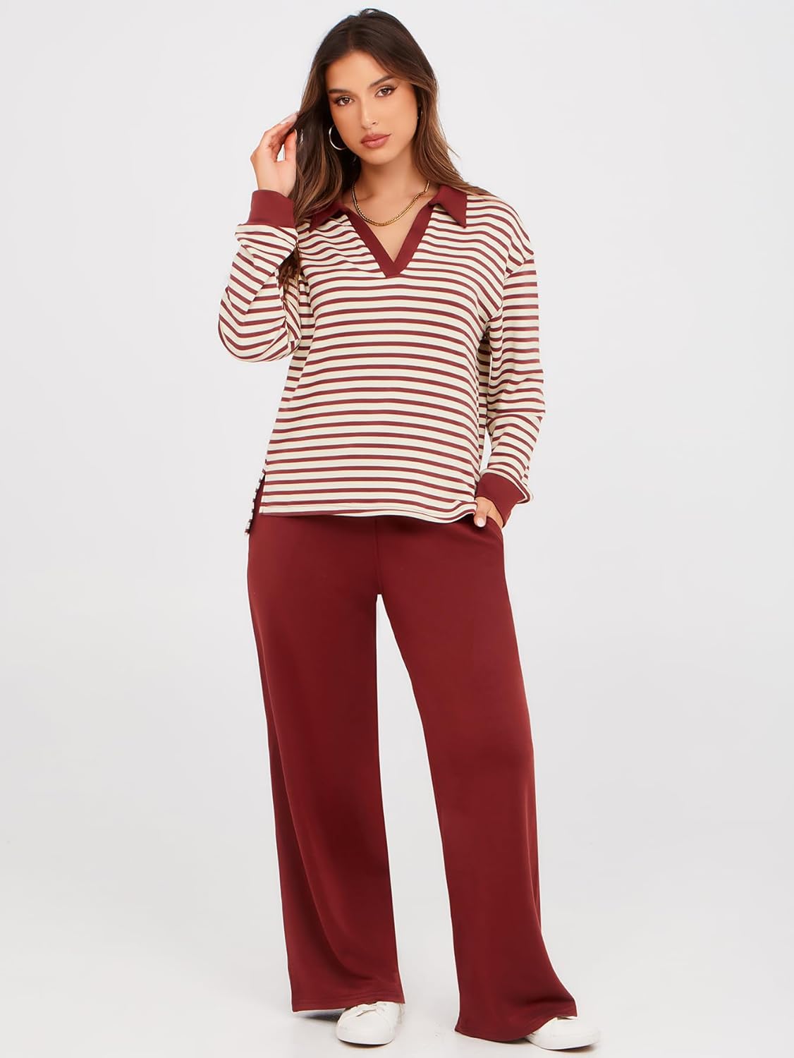 Glamaker - Conjunto de 2 piezas para mujer, estilo casual, manga larga, sudadera tipo polo y pantalones anchos a juego